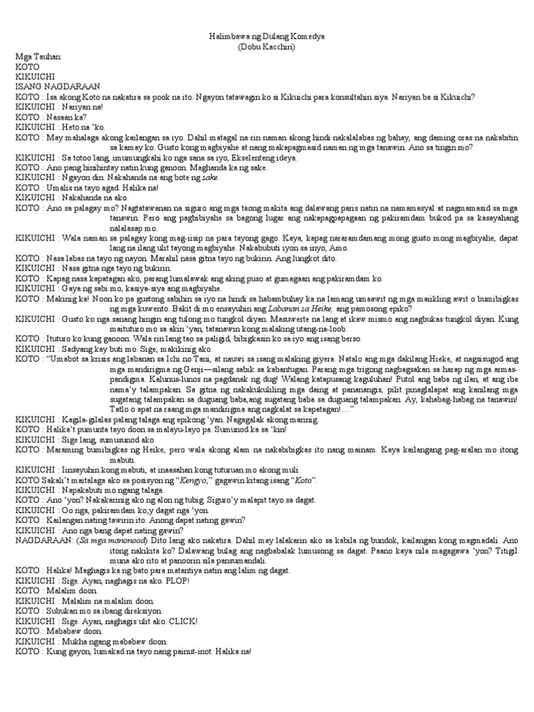 Nakakabagbag damdamin ang nangyari kay cardo dahil hindi nabigyan ng hustisya ang pagsabog ng. Halimbawa ng Dulang Komedya Dobu Kacchiri Mga Tauhan. Naglalaman ito ng katatawanan ngunit may kasama ring katotohanan.