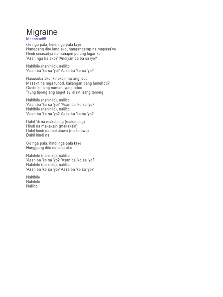 Ayoko na Niloko lang ako Ang sabi mo babalik ka pa Hindi mo ba alam Na naghihintay ako Sa pagbabalik ng pangako mo. Asan ba ko sayo. Lyrics to Migraine by Moonstar88.
