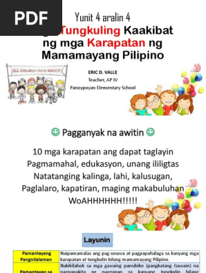 Madalas dumadalaw sa magulang ang nag-asawang anak kapag itoy naninirahan sa ibang lugar. 2272018 KARAPATAN NG BAWAT BATANG PILIPINO ARTIKULO 1 Magkaroon ng karapatan sa pag-alam ng imoprmasyong makabubuti sa kanilang kalusugan at pagkatao kalayaanpag-iisip pananampalataya pribadong pamumuhay at paglahok sa mga organisasyon. The child has the right to eat to become healthy and strong.