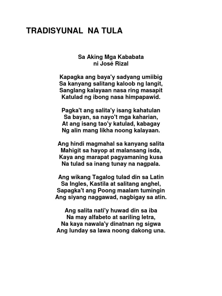 10282019 Tula para sa ama na may 12 pantig 4saknong. 10102017 Ang mga tula tungkol sa Ina na inyong mababasa ay buhat sa ibat-ibang makatang Pilipino na aming pinagsama-sama. 4 - I always do this3 - I often do this2 - I sometimes do this1 - I seldom do this.