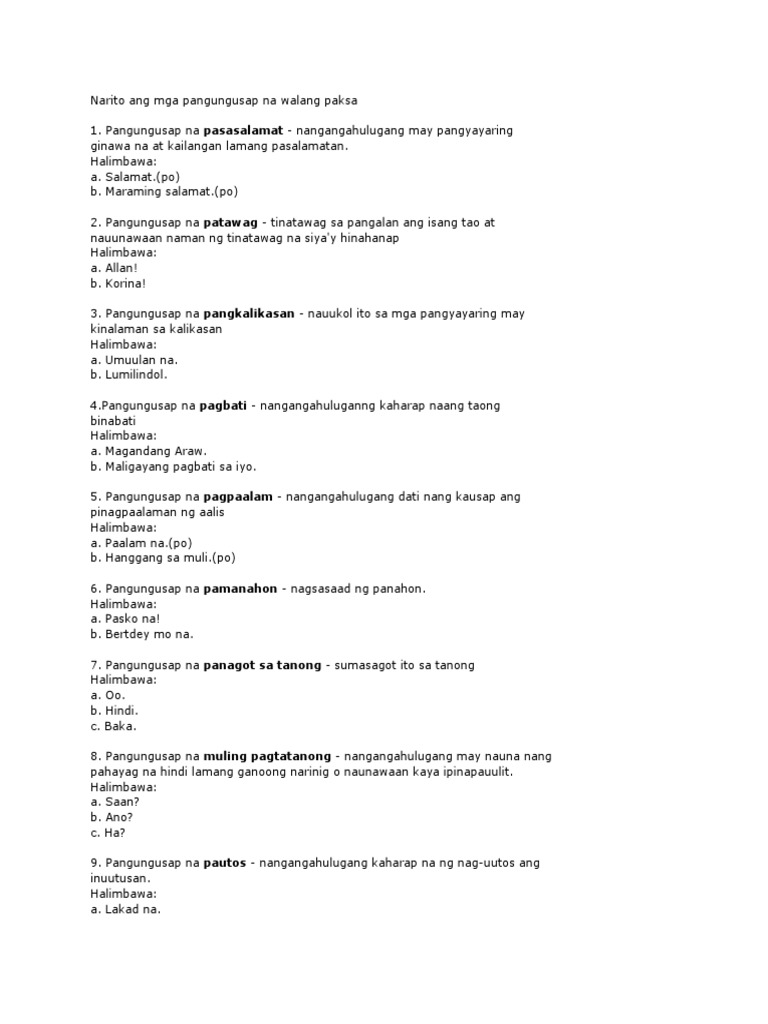 Ano ano ang mga pangungusap na walang simuno. Anong uri ng pangungusap na walang simuno an nasa halimbawa Bukas na a from EDUCATION HIGH SCHOO at University of Mindanao - Main Campus Matina Davao City. Halimbawa ng karaniwang ayos at di-karaniwang ayos Kabuuang mga Sagot. Skip to main content.